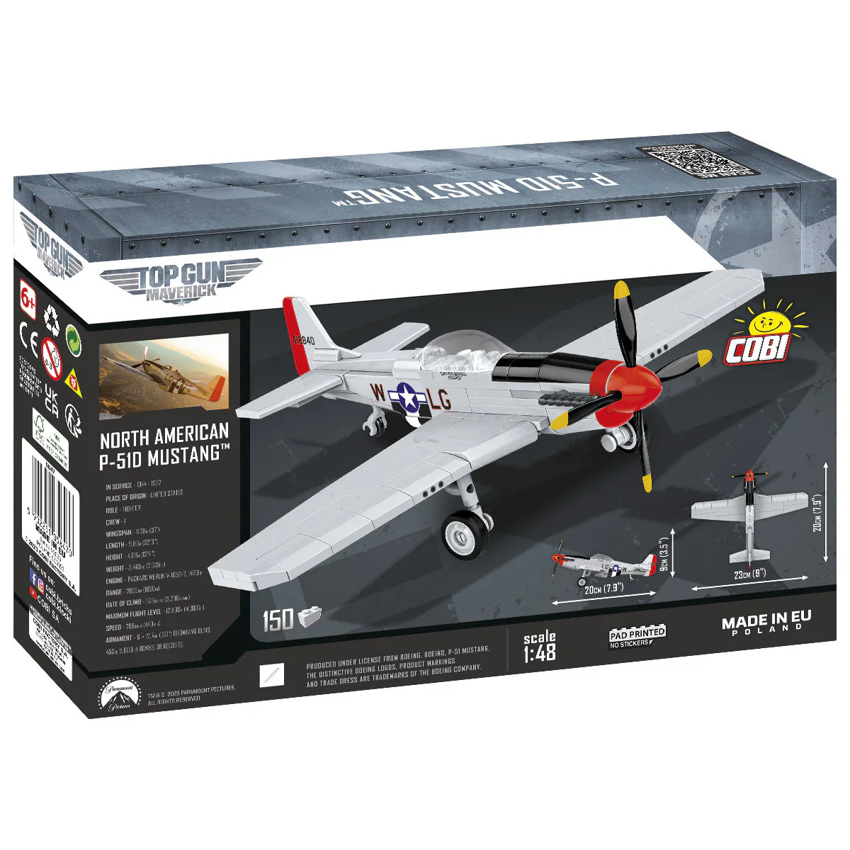The Mustang P-51D is a unique model of the movie aircraft released under the original TOP GUN: Maverick⢠license. The main character of the film takes great pride in owning this very aircraft. The model was designed with 150 COBI construction blocks in 1:48 scale and includes only high-quality prints recreating the markings of the movie plane. The licensed Mustang made of COBI bricks is not only a great movie toy, but also a model that can start a collection among fans of action movies, aviation and military technology!